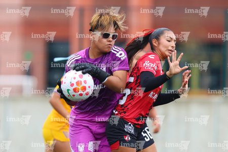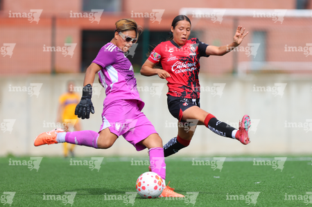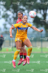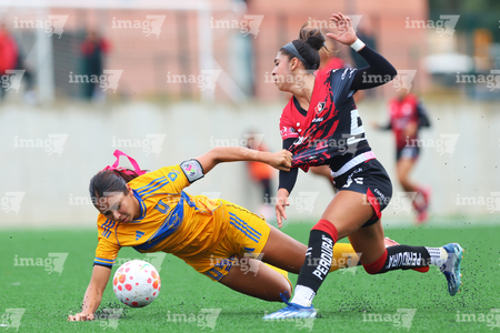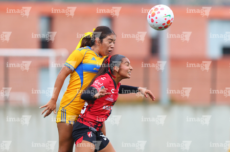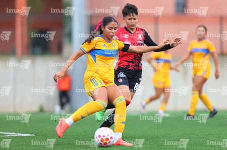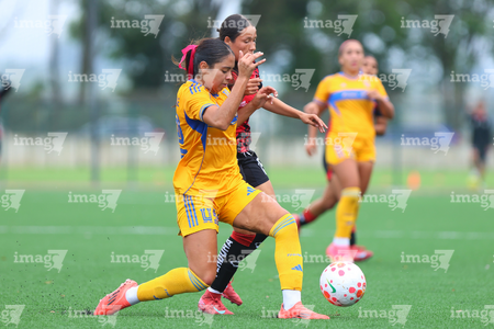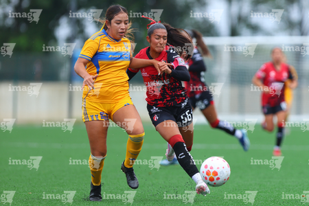 Guadalajara, Jalisco, 25 de septiembre de 2025. Alexia Gutiérrez (I) y Estrella Franco (D), durante el partido correspondiente a la jornada 12 del torneo Apertura 2025 de la Liga BBVA MX Femenil categoría Sub19, entre las Rojinegras del Atlas y las Tigres de la UANL, realizado en la Academia AGA. Foto: Imago7/ Juan Carlos Cubeyro.