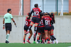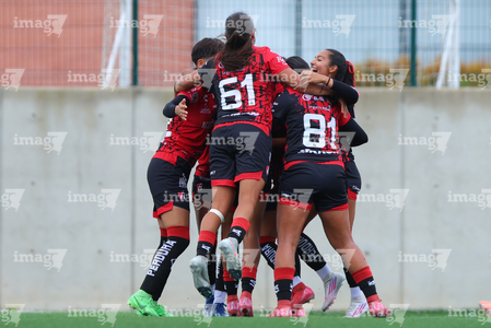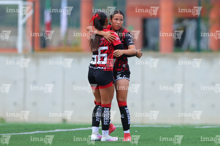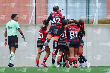 Guadalajara, Jalisco, 25 de septiembre de 2025. Jugadoras de Atlas en festejo de gol, durante el partido correspondiente a la jornada 12 del torneo Apertura 2025 de la Liga BBVA MX Femenil categoría Sub19, entre las Rojinegras del Atlas y las Tigres de la UANL, realizado en la Academia AGA. Foto: Imago7/ Juan Carlos Cubeyro.