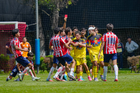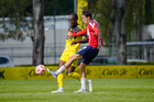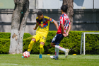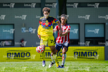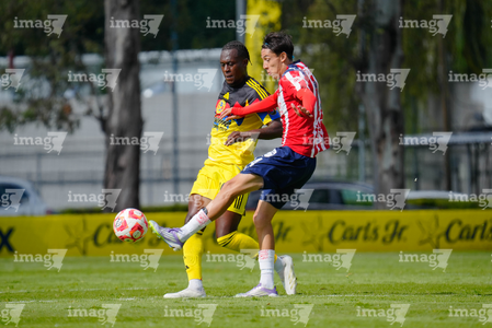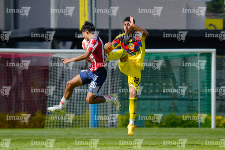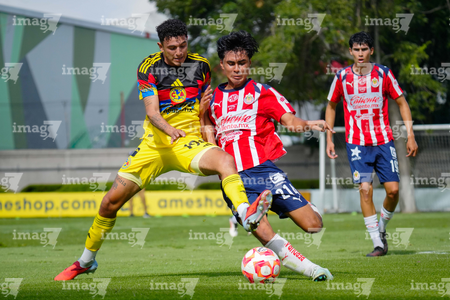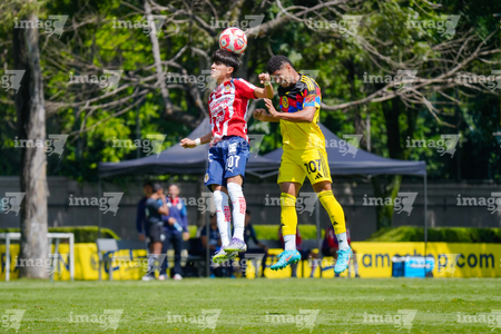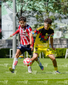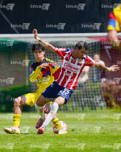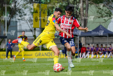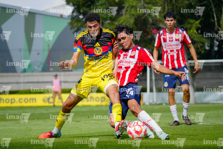Ciudad de México, 12 de septiembre de 2025. Francisco García y Yohan Orozco, durante el partido correspondiente a la jornada 8 del torneo Apertura 2025 de la Liga BBVA MX categoría Sub21, entre las Águilas del América y las Chivas Rayadas del Guadalajara, realizado en Coapa. Foto: Imago7/Diego Padilla