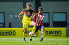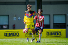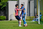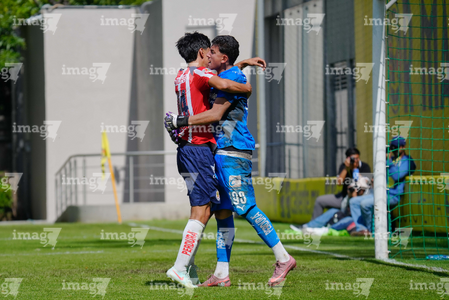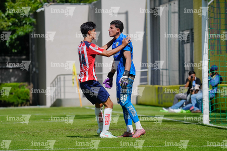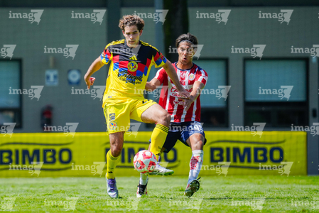 Ciudad de México, 12 de septiembre de 2025. Hugo Buyla y Maximiliano Bustos, durante el partido correspondiente a la jornada 8 del torneo Apertura 2025 de la Liga BBVA MX categoría Sub21, entre las Águilas del América y las Chivas Rayadas del Guadalajara, realizado en Coapa. Foto: Imago7/Diego Padilla