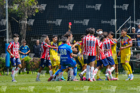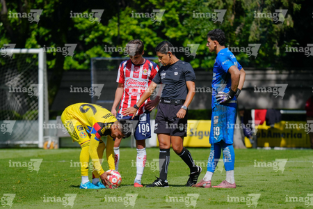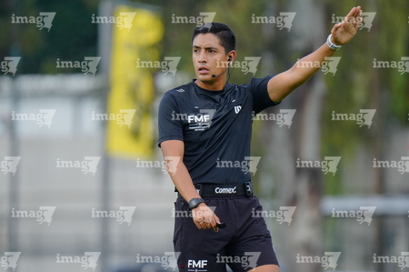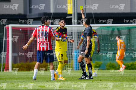 Ciudad de México, 12 de septiembre de 2025. José Andrés Elías Zarzoza árbitro central, durante el partido correspondiente a la jornada 8 del torneo Apertura 2025 de la Liga BBVA MX categoría Sub21, entre las Águilas del América y las Chivas Rayadas del Guadalajara, realizado en Coapa. Foto: Imago7/Diego Padilla