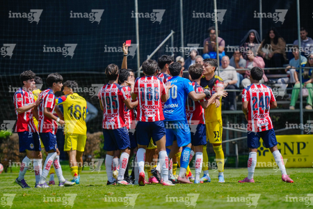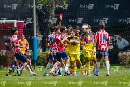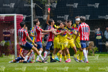 Ciudad de México, 12 de septiembre de 2025. José Gallegos en reclamo, durante el partido correspondiente a la jornada 8 del torneo Apertura 2025 de la Liga BBVA MX categoría Sub21, entre las Águilas del América y las Chivas Rayadas del Guadalajara, realizado en Coapa. Foto: Imago7/Diego Padilla
