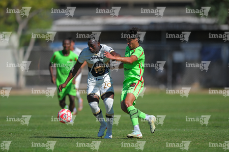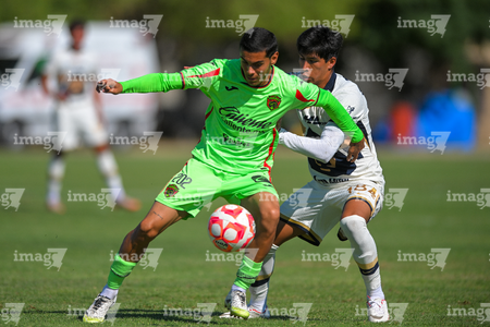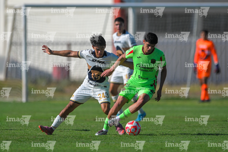 Ciudad Juárez, Chihuahua, 23 de septiembre de 2025. Norberto Jimenez y Ricardo Juárez, durante el partido correspondiente a la jornada 10 del torneo Apertura 2025 de la Liga BBVA MX categoría Sub21, entre los Bravos de FC Juárez y los Pumas de la UNAM, realizado en realizado en el Instituto Tecnológico de Ciudad Juárez. Foto: Imago7/ José Zamora