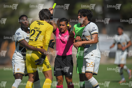 Ciudad Juárez, Chihuahua, 23 de septiembre de 2025. Ángel Efrén Sotelo, árbitro central muestra tarjeta amarilla de Amonestación, durante el partido correspondiente a la jornada 10 del torneo Apertura 2025 de la Liga BBVA MX categoría Sub21, entre los Bravos de FC Juárez y los Pumas de la UNAM, realizado en realizado en el Instituto Tecnológico de Ciudad Juárez. Foto: Imago7/ José Zamora
