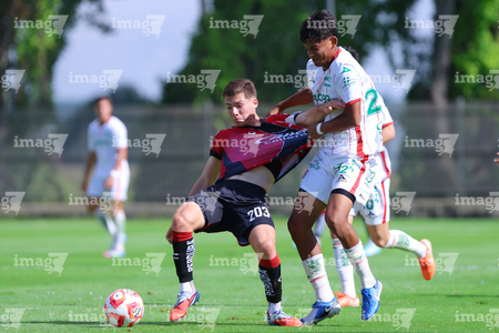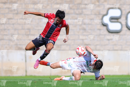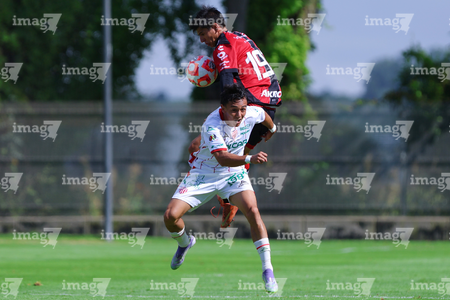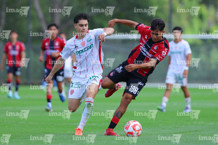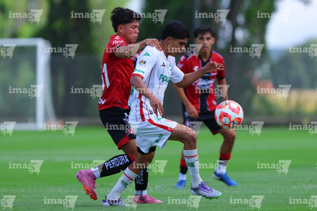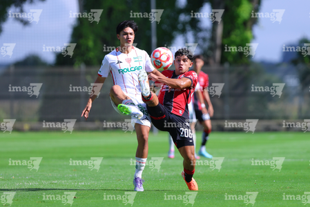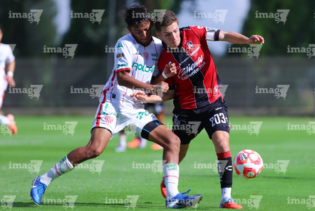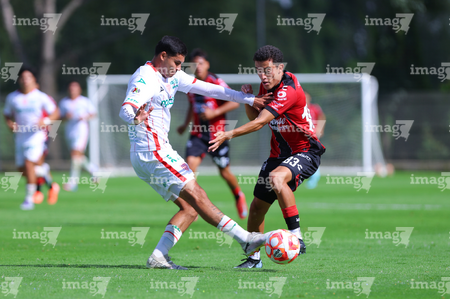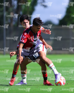 Guadalajara, Jalisco, 27 de septiembre de 2025. José Santoyo (I) y Jesús Guillén (D), durante el partido correspondiente a la jornada 11 del torneo Apertura 2025 de la Liga BBVA MX categoría Sub21, entre los Rojinegros del Atlas y los Rayos del Necaxa, realizado en la Academia AGA. Foto: Imago7/ Juan Carlos Cubeyro.