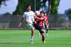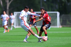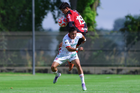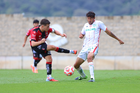 Guadalajara, Jalisco, 27 de septiembre de 2025. José Martín (I) y Paul Valle (D), durante el partido correspondiente a la jornada 11 del torneo Apertura 2025 de la Liga BBVA MX categoría Sub21, entre los Rojinegros del Atlas y los Rayos del Necaxa, realizado en la Academia AGA. Foto: Imago7/ Juan Carlos Cubeyro.