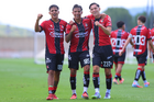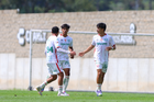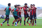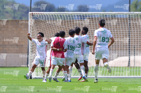 Guadalajara, Jalisco, 27 de septiembre de 2025. Jugadores de Necaxa en festejo de gol, durante el partido correspondiente a la jornada 11 del torneo Apertura 2025 de la Liga BBVA MX categoría Sub21, entre los Rojinegros del Atlas y los Rayos del Necaxa, realizado en la Academia AGA. Foto: Imago7/ Juan Carlos Cubeyro.