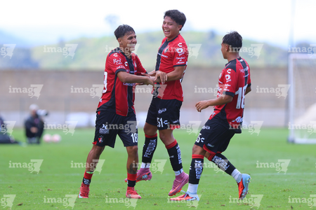 Guadalajara, Jalisco, 27 de septiembre de 2025. Luis Suárez, Ángel Sevilla y Anthony Bautista en festejo, durante el partido correspondiente a la jornada 11 del torneo Apertura 2025 de la Liga BBVA MX categoría Sub21, entre los Rojinegros del Atlas y los Rayos del Necaxa, realizado en la Academia AGA. Foto: Imago7/ Juan Carlos Cubeyro.