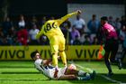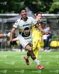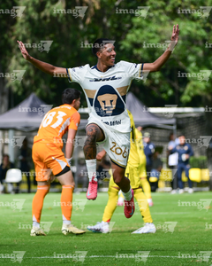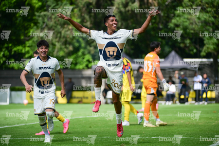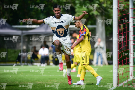 Ciudad de México, 27 de septiembre de 2025. Misael Torres en festejo de gol, durante el partido correspondiente a la jornada 11 del torneo Apertura 2025 de la Liga BBVA MX categoría Sub21, entre las Águilas del América y los Pumas de la UNAM, realizado en Coapa. Foto: Imago7/ Alexis Chavez