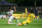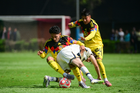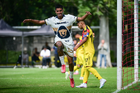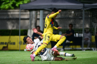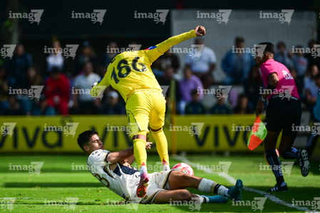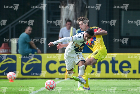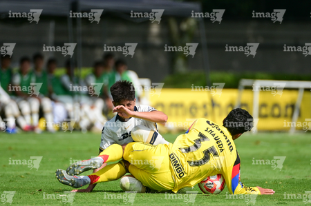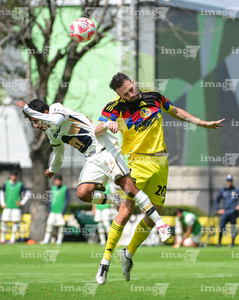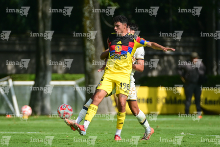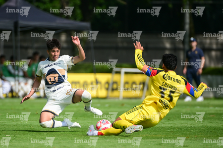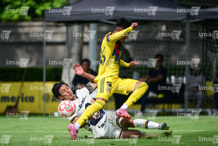 Ciudad de México, 27 de septiembre de 2025. Ángel Rico y Joshua Strimling, durante el partido correspondiente a la jornada 11 del torneo Apertura 2025 de la Liga BBVA MX categoría Sub21, entre las Águilas del América y los Pumas de la UNAM, realizado en Coapa. Foto: Imago7/ Alexis Chavez