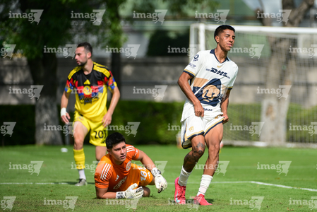 Ciudad de México, 27 de septiembre de 2025. Gerardo Serralde y Patricio Salas, durante el partido correspondiente a la jornada 11 del torneo Apertura 2025 de la Liga BBVA MX categoría Sub21, entre las Águilas del América y los Pumas de la UNAM, realizado en Coapa. Foto: Imago7/ Alexis Chavez