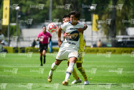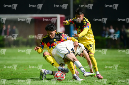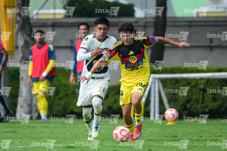 Ciudad de México, 27 de septiembre de 2025. Iker Jiménez y Diego Arriaga, durante el partido correspondiente a la jornada 11 del torneo Apertura 2025 de la Liga BBVA MX categoría Sub21, entre las Águilas del América y los Pumas de la UNAM, realizado en Coapa. Foto: Imago7/ Alexis Chavez