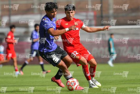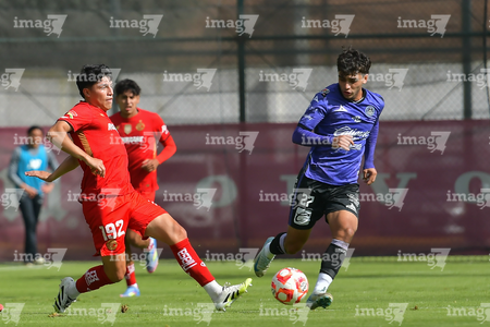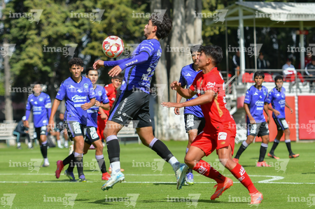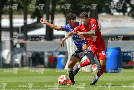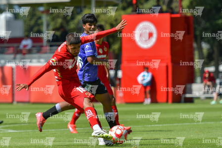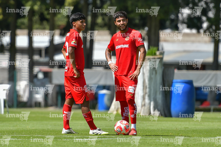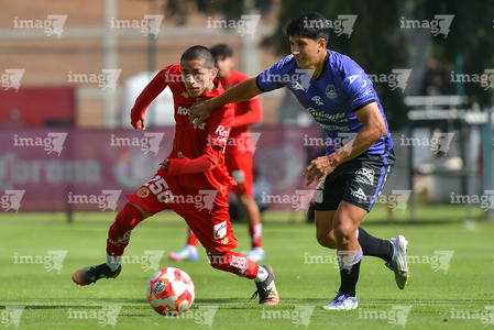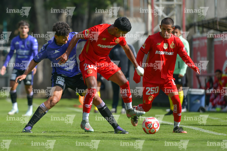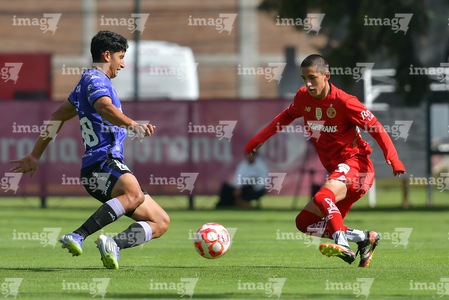 Metepec, Estado de México, 28 de septiembre de 2025. José Estrada y Luis Carrillo , durante el partido correspondiente a la jornada 11 del torneo Apertura 2025 de la Liga BBVA MX categoría Sub21, entre los Diablos Rojos del Toluca y los Cañoneros del Mazatlán FC, realizado en las instalaciones de Metepec. Foto: Imago7/ Arturo Hernandez