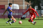 Metepec, Estado de México, 28 de septiembre de 2025. Juan López y Kevin Martínez, durante el partido correspondiente a la jornada 11 del torneo Apertura 2025 de la Liga BBVA MX categoría Sub21, entre los Diablos Rojos del Toluca y los Cañoneros del Mazatlán FC, realizado en las instalaciones de Metepec. Foto: Imago7/ Arturo Hernandez