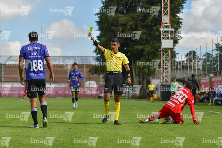 Metepec, Estado de México, 28 de septiembre de 2025. Aarón Vega Cabrera , árbitro central muestra tarjeta amarilla de amonestación, durante el partido correspondiente a la jornada 11 del torneo Apertura 2025 de la Liga BBVA MX categoría Sub21, entre los Diablos Rojos del Toluca y los Cañoneros del Mazatlán FC, realizado en las instalaciones de Metepec. Foto: Imago7/ Arturo Hernandez