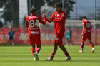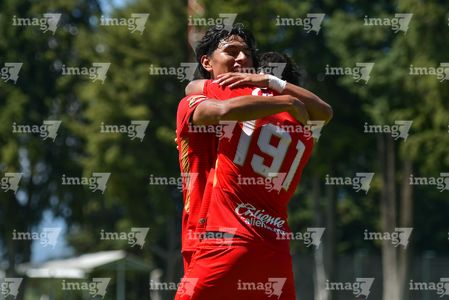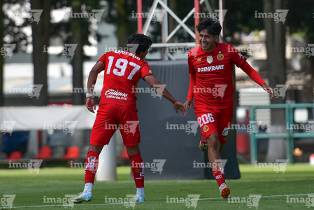 Metepec, Estado de México, 28 de septiembre de 2025. Edher Segura y Kevin Martínez en festejo de gol , durante el partido correspondiente a la jornada 11 del torneo Apertura 2025 de la Liga BBVA MX categoría Sub21, entre los Diablos Rojos del Toluca y los Cañoneros del Mazatlán FC, realizado en las instalaciones de Metepec. Foto: Imago7/ Arturo Hernandez