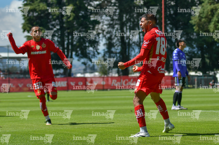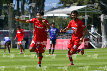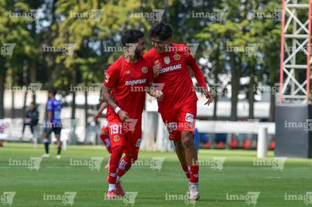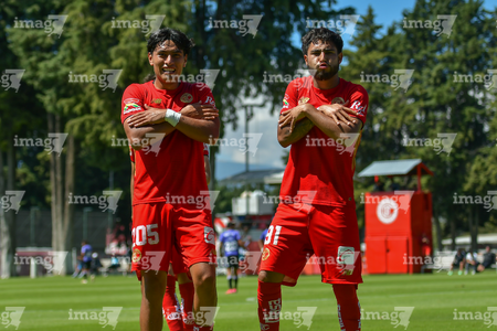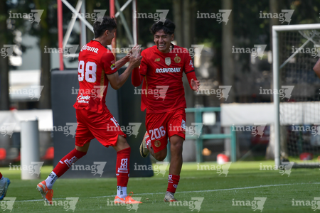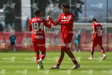 Metepec, Estado de México, 28 de septiembre de 2025. José Estrada y Sebastian Aceves en festejo de gol, durante el partido correspondiente a la jornada 11 del torneo Apertura 2025 de la Liga BBVA MX categoría Sub21, entre los Diablos Rojos del Toluca y los Cañoneros del Mazatlán FC, realizado en las instalaciones de Metepec. Foto: Imago7/ Arturo Hernandez