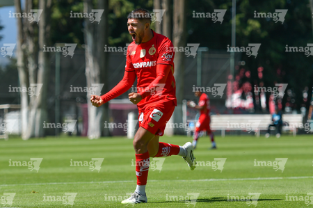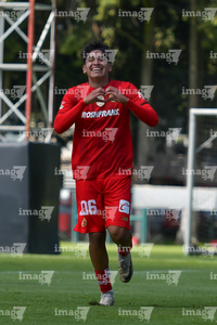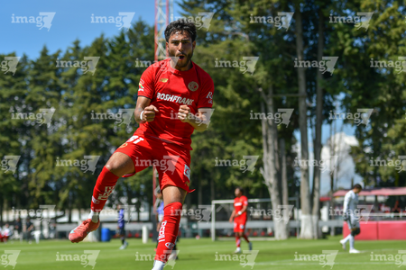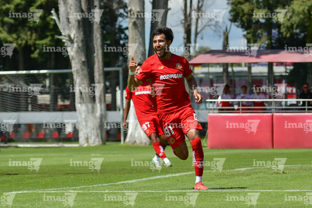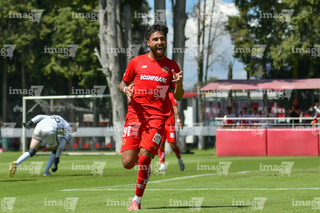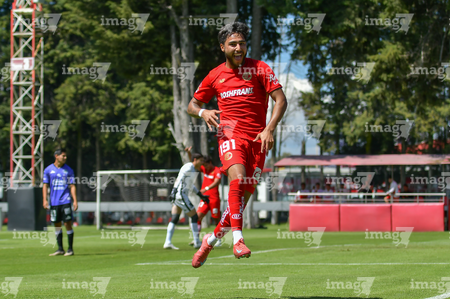 Metepec, Estado de México, 28 de septiembre de 2025. Juan López en festejo de gol, durante el partido correspondiente a la jornada 11 del torneo Apertura 2025 de la Liga BBVA MX categoría Sub21, entre los Diablos Rojos del Toluca y los Cañoneros del Mazatlán FC, realizado en las instalaciones de Metepec. Foto: Imago7/ Arturo Hernandez