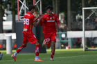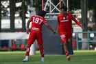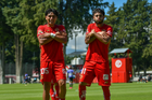 Metepec, Estado de México, 28 de septiembre de 2025. Rodrigo Cruz y Erick Orta en festejo de gol, durante el partido correspondiente a la jornada 11 del torneo Apertura 2025 de la Liga BBVA MX categoría Sub21, entre los Diablos Rojos del Toluca y los Cañoneros del Mazatlán FC, realizado en las instalaciones de Metepec. Foto: Imago7/ Arturo Hernandez