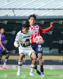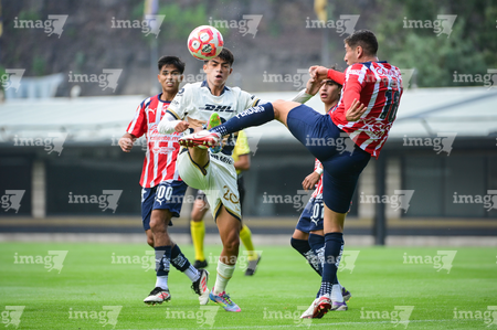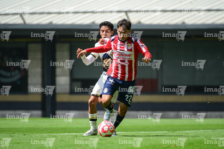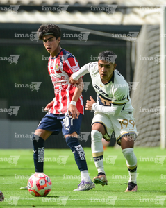 Ciudad de México, 5 de octubre de 2025. Raul Martinez y Diego Contreras, durante el partido correspondiente a la jornada 12 del torneo Apertura 2025 de la Liga BBVA MX categoría Sub21, entre los Pumas de la UNAM y las Chivas Rayadas del Guadalajara, realizado en Cantera. Foto: Imago7/ Alexis Chavez