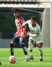 Ciudad de México, 5 de octubre de 2025. Gerardo Serralde y Leonardo Torres, durante el partido correspondiente a la jornada 12 del torneo Apertura 2025 de la Liga BBVA MX categoría Sub21, entre los Pumas de la UNAM y las Chivas Rayadas del Guadalajara, realizado en Cantera. Foto: Imago7/ Alexis Chavez