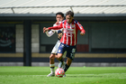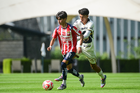 Ciudad de México, 5 de octubre de 2025. Raul Martinez y Kléber Carranza, durante el partido correspondiente a la jornada 12 del torneo Apertura 2025 de la Liga BBVA MX categoría Sub21, entre los Pumas de la UNAM y las Chivas Rayadas del Guadalajara, realizado en Cantera. Foto: Imago7/ Alexis Chavez