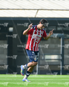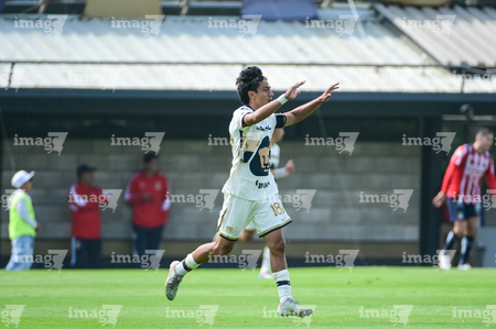 Ciudad de México, 5 de octubre de 2025. Carlos Corona en festejo de gol, durante el partido correspondiente a la jornada 12 del torneo Apertura 2025 de la Liga BBVA MX categoría Sub21, entre los Pumas de la UNAM y las Chivas Rayadas del Guadalajara, realizado en Cantera. Foto: Imago7/ Alexis Chavez