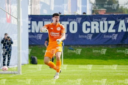 Ciudad de México, 18 de octubre de 2025. César Lugo ataja penal, durante el partido correspondiente a la jornada 13 del torneo Apertura 2025 de la Liga BBVA MX categoría Sub21, entre la Máquina Celeste del Cruz Azul y las Águilas del América, realizado en La Noria. Foto: Imago7/Diego Padilla