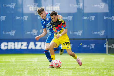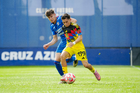 Ciudad de México, 18 de octubre de 2025. José Aldana y Etsgar Cruz, durante el partido correspondiente a la jornada 13 del torneo Apertura 2025 de la Liga BBVA MX categoría Sub21, entre la Máquina Celeste del Cruz Azul y las Águilas del América, realizado en La Noria. Foto: Imago7/Diego Padilla