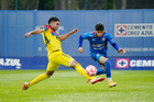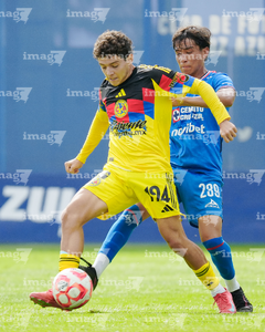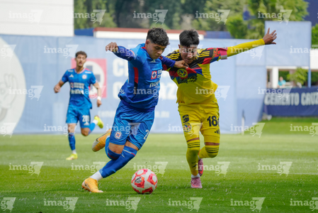 Ciudad de México, 18 de octubre de 2025. Ícaro Da Conceição y Rogelio González, durante el partido correspondiente a la jornada 13 del torneo Apertura 2025 de la Liga BBVA MX categoría Sub21, entre la Máquina Celeste del Cruz Azul y las Águilas del América, realizado en La Noria. Foto: Imago7/Diego Padilla