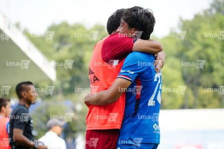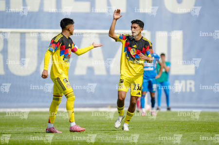Ciudad de México, 18 de octubre de 2025. Louis Estrada Derbez y Diego Reyes, durante el partido correspondiente a la jornada 13 del torneo Apertura 2025 de la Liga BBVA MX categoría Sub21, entre la Máquina Celeste del Cruz Azul y las Águilas del América, realizado en La Noria. Foto: Imago7/Diego Padilla