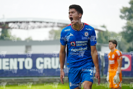 Ciudad de México, 18 de octubre de 2025. Bryan Casas en festejo de gol, durante el partido correspondiente a la jornada 13 del torneo Apertura 2025 de la Liga BBVA MX categoría Sub21, entre la Máquina Celeste del Cruz Azul y las Águilas del América, realizado en La Noria. Foto: Imago7/Diego Padilla
