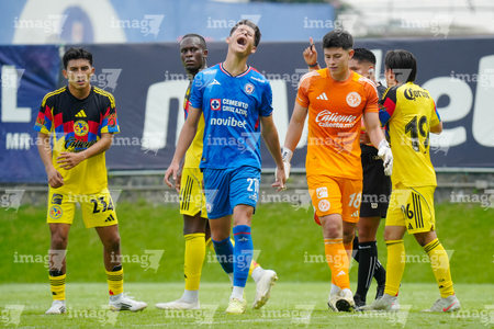 Ciudad de México, 18 de octubre de 2025. Hugo Buyla en reclamo, durante el partido correspondiente a la jornada 13 del torneo Apertura 2025 de la Liga BBVA MX categoría Sub21, entre la Máquina Celeste del Cruz Azul y las Águilas del América, realizado en La Noria. Foto: Imago7/Diego Padilla