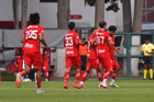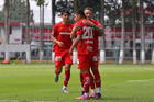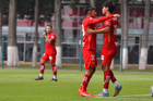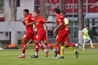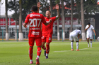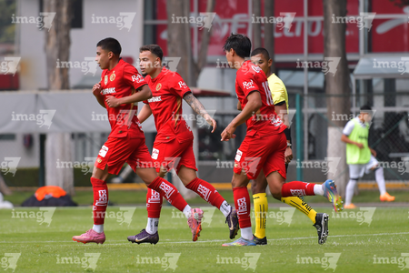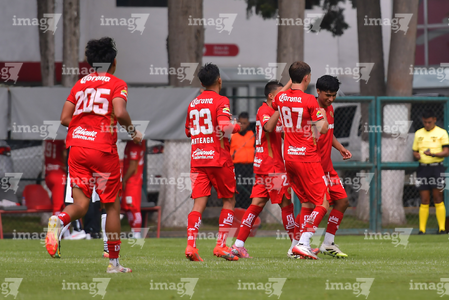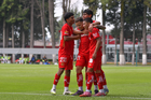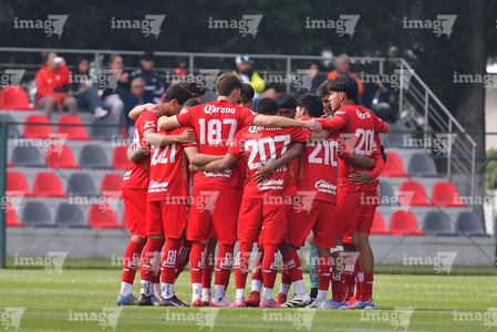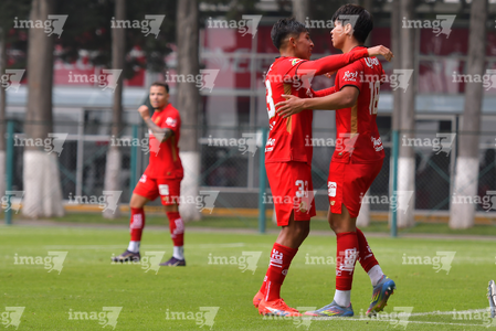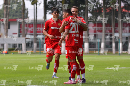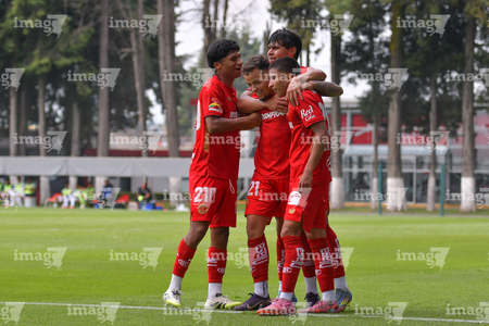 Metepec, Estado de México, 19 de octubre de 2025. Jugadores del Toluca sub21 en festejo de gol, durante el partido correspondiente a la jornada 13 del torneo Apertura 2025 de la Liga BBVA MX categoría Sub21, entre los Diablos Rojos del Toluca y los Gallos Blancos del Querétaro, realizado en las instalaciones de Metepec. Foto: Imago7/ Arturo Hernandez