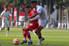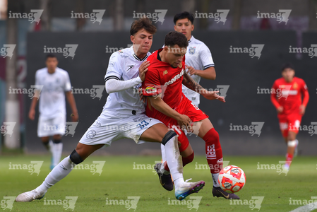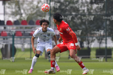 Metepec, Estado de México, 19 de octubre de 2025. Fabricio Francelino y Héctor Madera, durante el partido correspondiente a la jornada 13 del torneo Apertura 2025 de la Liga BBVA MX categoría Sub21, entre los Diablos Rojos del Toluca y los Gallos Blancos del Querétaro, realizado en las instalaciones de Metepec. Foto: Imago7/ Arturo Hernandez