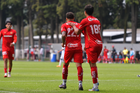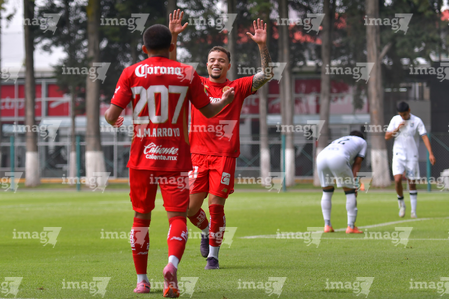 Metepec, Estado de México, 19 de octubre de 2025. Víctor Arteaga y Giovani Bravo en festejo de gol, durante el partido correspondiente a la jornada 13 del torneo Apertura 2025 de la Liga BBVA MX categoría Sub21, entre los Diablos Rojos del Toluca y los Gallos Blancos del Querétaro, realizado en las instalaciones de Metepec. Foto: Imago7/ Arturo Hernandez
