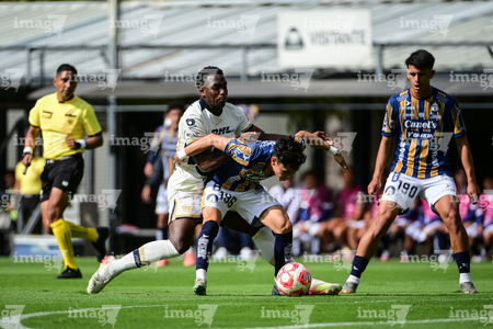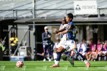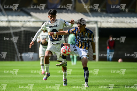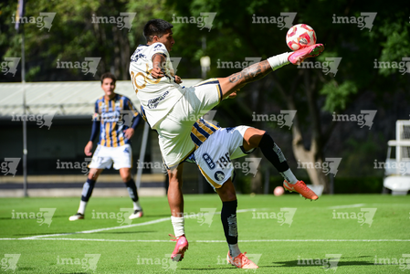 Ciudad de México, 22 de octubre de 2025. Norberto Jimenez y Jason Flores, durante el partido correspondiente a la jornada 14 del torneo Apertura 2025 de la Liga BBVA MX categoría Sub21, entre los Pumas de la UNAM y el Atlético de San Luis, realizado en Cantera. Foto: Imago7/ Alexis Chavez