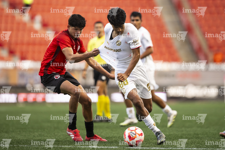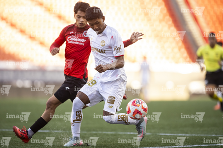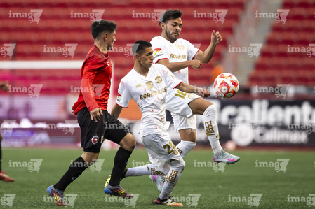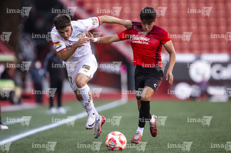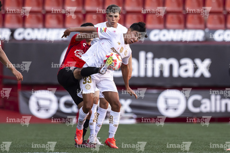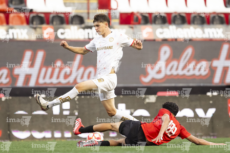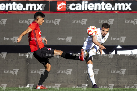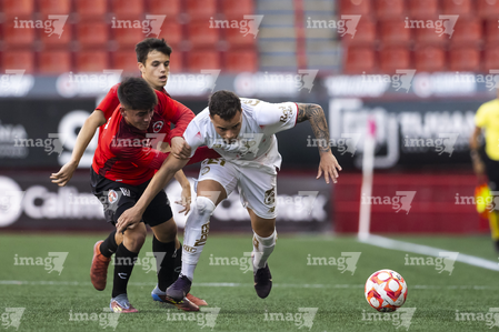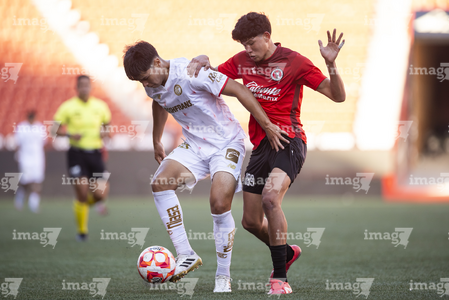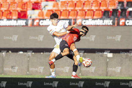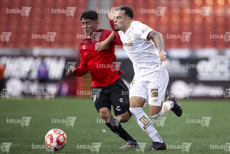 Tijuana, Baja California, 22 de octubre de 2025. José Estrada y Sebastián Cervantes, durante el partido correspondiente a la jornada 14 del torneo Apertura 2025 de la Liga BBVA MX categoría Sub21, entre los Xolos de Tijuana y los Diablos Rojos del Toluca, realizado en el Estadio Caliente. Foto: Imago7/Alejandro Gutiérrez Mora
