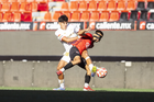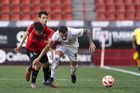 Tijuana, Baja California, 22 de octubre de 2025. Germán Padilla y Fabricio Francelino, durante el partido correspondiente a la jornada 14 del torneo Apertura 2025 de la Liga BBVA MX categoría Sub21, entre los Xolos de Tijuana y los Diablos Rojos del Toluca, realizado en el Estadio Caliente. Foto: Imago7/Alejandro Gutiérrez Mora