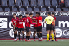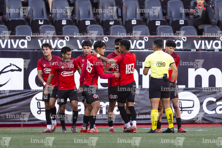 Tijuana, Baja California, 22 de octubre de 2025.Jugadores de Xolos en festejo de gol, durante el partido correspondiente a la jornada 14 del torneo Apertura 2025 de la Liga BBVA MX categoría Sub21, entre los Xolos de Tijuana y los Diablos Rojos del Toluca, realizado en el Estadio Caliente. Foto: Imago7/Alejandro Gutiérrez Mora