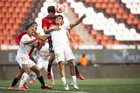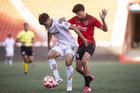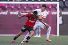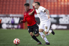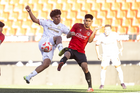 Tijuana, Baja California, 22 de octubre de 2025. David Osuna y Fabricio Francelino, durante el partido correspondiente a la jornada 14 del torneo Apertura 2025 de la Liga BBVA MX categoría Sub21, entre los Xolos de Tijuana y los Diablos Rojos del Toluca, realizado en el Estadio Caliente. Foto: Imago7/Alejandro Gutiérrez Mora