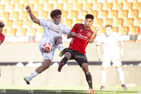 Tijuana, Baja California, 22 de octubre de 2025. Joban González y Juan Estrada, durante el partido correspondiente a la jornada 14 del torneo Apertura 2025 de la Liga BBVA MX categoría Sub21, entre los Xolos de Tijuana y los Diablos Rojos del Toluca, realizado en el Estadio Caliente. Foto: Imago7/Alejandro Gutiérrez Mora
