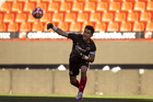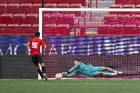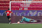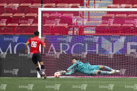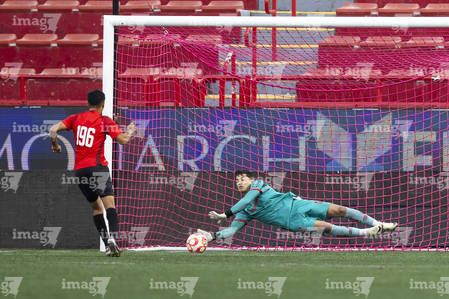Tijuana, Baja California, 22 de octubre de 2025. Ronaldo Beltrán ataja penal, durante el partido correspondiente a la jornada 14 del torneo Apertura 2025 de la Liga BBVA MX categoría Sub21, entre los Xolos de Tijuana y los Diablos Rojos del Toluca, realizado en el Estadio Caliente. Foto: Imago7/Alejandro Gutiérrez Mora