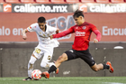 Tijuana, Baja California, 22 de octubre de 2025. José Quiroz y Omar Godínez, durante el partido correspondiente a la jornada 14 del torneo Apertura 2025 de la Liga BBVA MX categoría Sub21, entre los Xolos de Tijuana y los Diablos Rojos del Toluca, realizado en el Estadio Caliente. Foto: Imago7/Alejandro Gutiérrez Mora