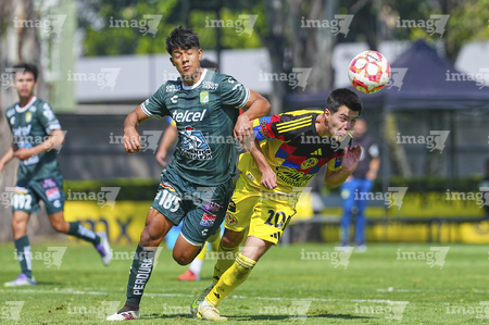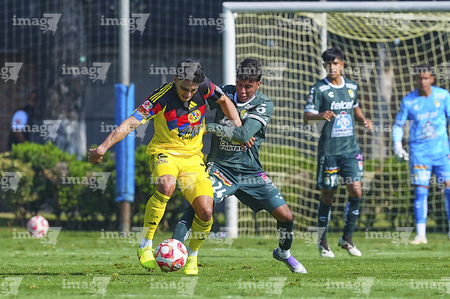 Ciudad de México, 1 de noviembre de 2025. Santiago Naveda y , durante el partido correspondiente a la jornada 16 del torneo Apertura 2025 de la Liga BBVA MX categoría Sub21, entre las Águilas del América y los Esmeraldas del León, realizado en Coapa. Foto: Imago7/