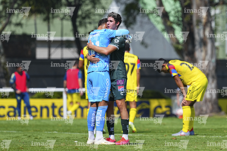 Ciudad de México, 1 de noviembre de 2025. Juan Brizuela y Santiago Naveda, durante el partido correspondiente a la jornada 16 del torneo Apertura 2025 de la Liga BBVA MX categoría Sub21, entre las Águilas del América y los Esmeraldas del León, realizado en Coapa. Foto: Imago7/