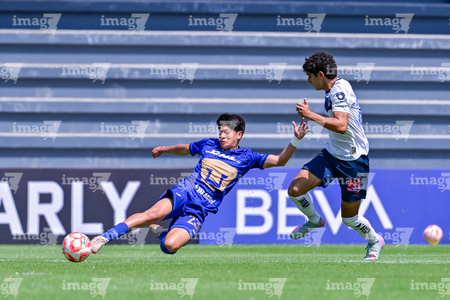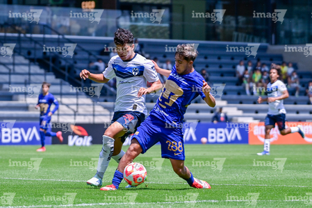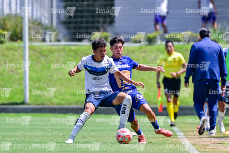 Toluca, Estado de México, 5 de septiembre de 2025. Alejandro Juárez y Alfonso Arguelles, durante el partido correspondiente a la jornada 5 del Torneo Internacional de Fuerzas Básicas 2025 de la Liga BBVA MX, entre los Pumas de la UNAM y los Rayados del Monterrey, celebrado en la Federación Mexicana de Futbol. Foto: Imago7/ Mauricio Ruiz