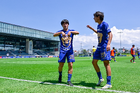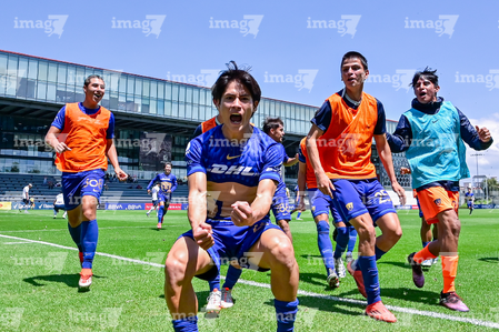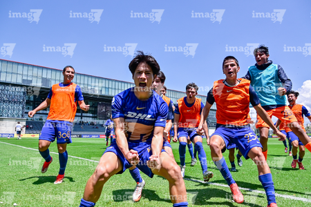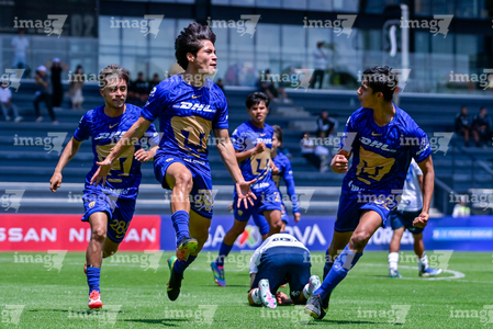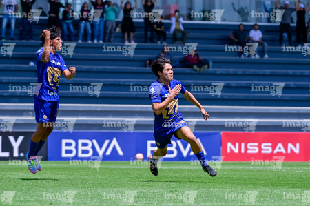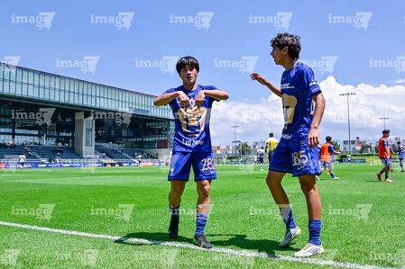 Toluca, Estado de México, 5 de septiembre de 2025. Cristiano Silva y Nicolás Lugo en festejo de gol, durante el partido correspondiente a la jornada 5 del Torneo Internacional de Fuerzas Básicas 2025 de la Liga BBVA MX, entre los Pumas de la UNAM y los Rayados del Monterrey, celebrado en la Federación Mexicana de Futbol. Foto: Imago7/ Mauricio Ruiz