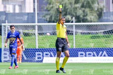 Toluca, Estado de México, 5 de septiembre de 2025. Alan Eduardo Contreras Sotelo, árbitro central muestra tarjeta amarilla de amonestación, durante el partido correspondiente a la jornada 5 del Torneo Internacional de Fuerzas Básicas 2025 de la Liga BBVA MX, entre los Pumas de la UNAM y los Rayados del Monterrey, celebrado en la Federación Mexicana de Futbol. Foto: Imago7/ Mauricio Ruiz