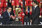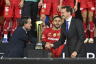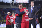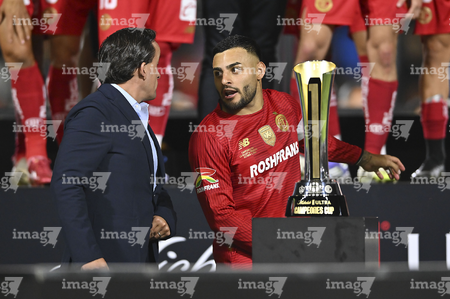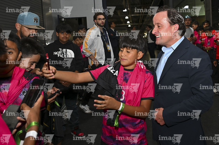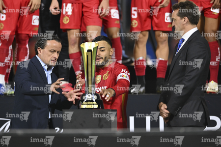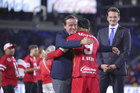 Carson, California, Estados Unidos, 1 de octubre de 2025. Mikel Arriola entregó el trofeo de campeón a Alexis Vega, durante el partido correspondiente al Campeones Cup 2025, entre el LA Galaxy y los Diablos Rojos del Toluca, realizado en el Dignity Health Sports Park. Foto: Imago7/ Etzel Espinosa